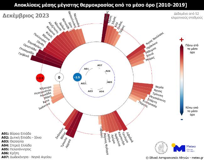 Συγκεκριμένα, σύμφωνα με το δίκτυο 52 μετεωρολογικών σταθμών του meteo.gr του Εθνικού Αστεροσκοπείου Αθηνών (ΕΑΑ) που λειτουργούν ανελλιπώς από το 2010 μέχρι σήμερα, τον φετινό Δεκέμβριο η μέση τιμή των μεγίστων ημερήσιων θερμοκρασιών κυμάνθηκε σε ακραία υψηλά επίπεδα σχεδόν στο σύνολο της χώρας, σε σχέση με τον μέσο όρο της περιόδου 2010-2019.