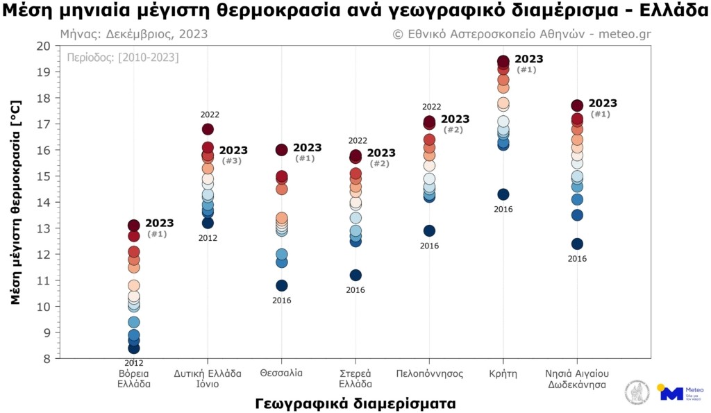 Στη Θεσσαλία ο Δεκέμβριος του 2023 ήταν κατά 1.1 °C θερμότερος από τον αντίστοιχο του 2022, τον αμέσως προήγουμενο θερμότερο Δεκέμβρη από το 2010.