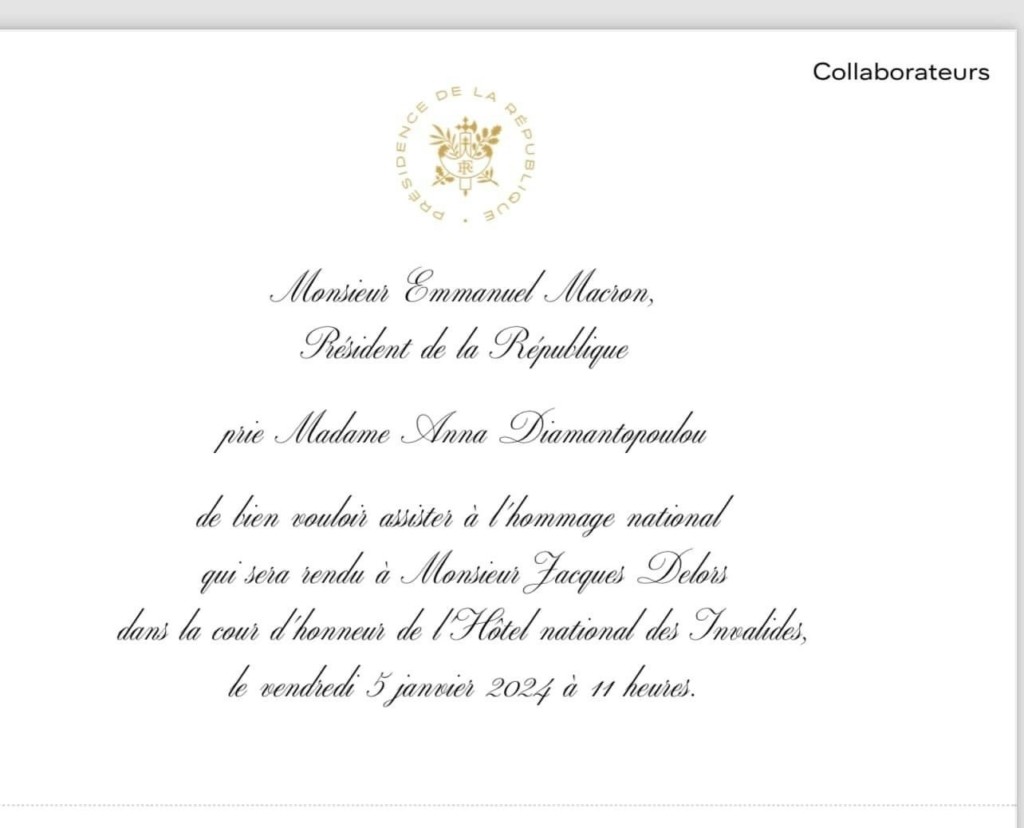 Όπως ανέφερε σε ανακοίνωσή της: «Σήμερα στο Παρίσι η επίσημη κηδεία και η απόδοση Εθνικής Τιμής στον Ζακ Ντελόρ στο Μέγαρο Απόμαχων. Η μεγαλοπρεπέστατη τελετή έγινε παρουσία όλης της Ευρωπαϊκής ηγεσίας, πολλών Αρχηγών κρατών και Πρωθυπουργών (και ο Ορμπαν!) και με εκπληκτική ομιλία του Προέδρου Μακρόν ο οποίος ήταν και ο προσκαλών.