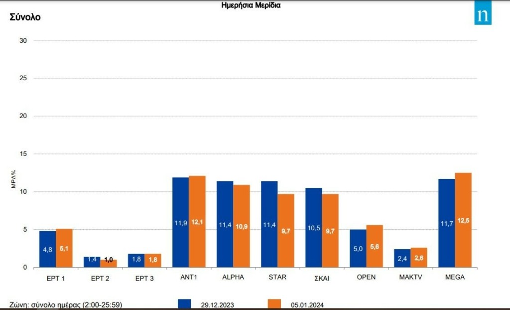 Ισόποσα ήταν τα μερίδια Star και ΣΚΑΪ, ενώ μεταξύ Open και ΕΡΤ1 η διαφορά στα μεγέθη των μεριδίων τους ήταν μόλις μισή ποσοστιαία μονάδα.