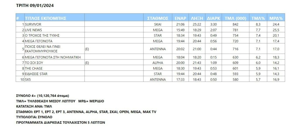 Με τηλεθέαση καλύτερη από εκείνη της Δευτέρας, αλλά μια θέση πιο κάτω στο χθεσινό Top 10 πλασαρίστηκε το κεντρικό δελτίο ειδήσεων του Mega. Παράδοξο αυτό που συνέβη αλλά όχι ασυνήθιστο καθώς παίζει ρόλο ο ανταγωνισμός και οι διαφορετικές συνθήκες μέσα στις οποίες αναπτύσσεται σε καθημερινή βάση.