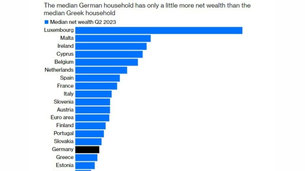 Σύμφωνα το Bloomberg, η παράμετρος της άνισης κατανομής πλούτου στη Γερμανία έχει υποεκτιμηθεί: Το πλουσιότερο 10% των νοικοκυριών κατέχει μέση καθαρή περιουσία αξίας πάνω από 725.000 ευρώ και ελέγχει περισσότερο από τον μισό πλούτο της χώρας, ενώ η περιουσία του φτωχότερου 40% δεν ξεπερνά τα 44.000 ευρώ, όπως απέδειξε έρευνα της Bundesbank το 2021.
