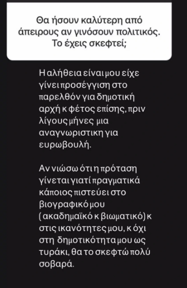 «Η αλήθεια είναι ότι μου είχε γίνει προσέγγιση στο παρελθόν για Δημοτική Αρχή και φέτος επίσης, μια αναγνωριστική για Ευρωβουλή. Αν νιώσω ότι η πρόταση γίνεται γιατί πραγματικά κάποιος πιστεύει στο βιογραφικό μου (ακαδημαϊκό και βιωματικό) και στις ικανότητές μου και όχι στη δημοτικότητά μου ως τυράκι, θα το σκεφτώ πολύ σοβαρά» ήταν η απάντησή της.