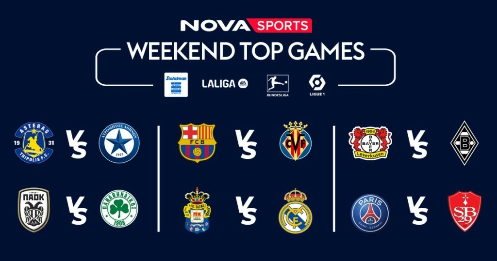 Ποδοσφαιρικό υπερθέαμα με περισσότερους από 40 LIVE αγώνες έρχεται και αυτή την εβδομάδα αποκλειστικά στο γήπεδο του Novasports! Με το μεγάλο ντέρμπι κορυφής ΠΑΟΚ – Παναθηναϊκός και Αστέρας Τρίπολης – Ατρόμητος, Πανσερραϊκός – Βόλος, να δεσπόζουν από το ελληνικό πρωτάθλημα ποδοσφαίρου, με τις αναμετρήσεις Μπαρτσελόνα – Βιγιαρεάλ, Λας Πάλμας – Ρεάλ Μαδρίτης για την LaLiga EA Sports, με Bundesliga και Μπάγερν Μονάχου εις διπλούν, με Ligue 1, Eredivisie και άλλα πολλά!