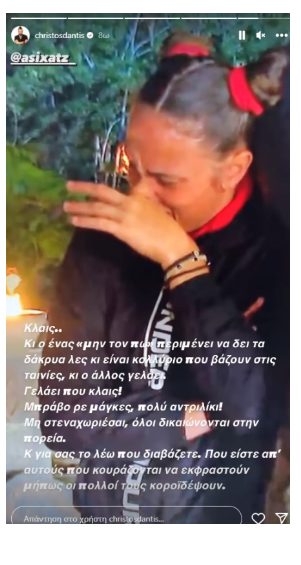 Την ίδια ώρα, ωστόσο, κάποιοι γελούσαν, κάτι που δεν πέρασε απαρατήρητο από τον Χρήστο Δάντη ο οποίος ξέσπασε μέσω μιας ανάρτησής του για τη συμπεριφορά αυτή απέναντι στη σύντροφό του.