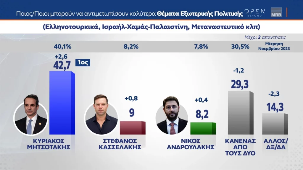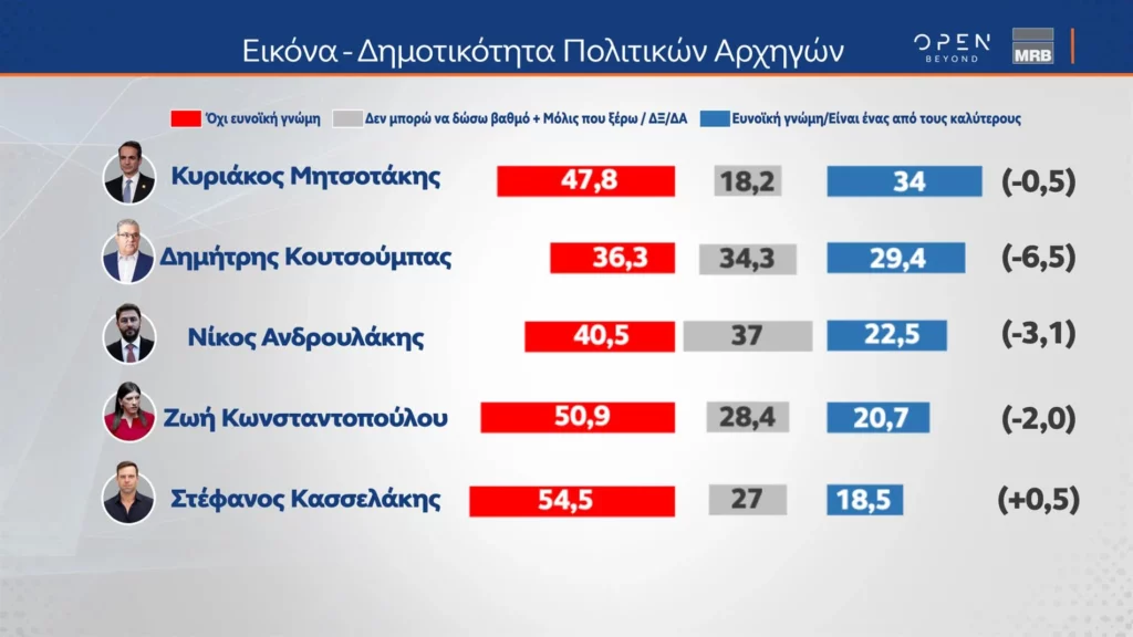Αναφορικά με τη δημοτικότητα των πολιτικών αρχηγών, πρώτος στην ευνοϊκή γνώμη των πολιτών είναι ο Κυριάκος Μητσοτάκης. Ακολουθεί ο Δημήτρης Κουτσούμπας, ενώ πιο κάτω στη λίστα βρίσκονται οι: Νίκος Ανδρουλάκης, Ζωή Κωνσταντοπούλου, Στέφανος Κασσελάκης, Κυριάκος Βελόπουλος, Αλέξης Χαρίτσης, Δημήτρης Νατσιός και Βασίλης Στίγκας.