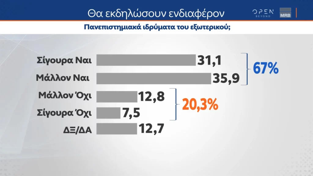 Σύμφωνα με την έρευνα, στο ερώτημα για τα ιδιωτικά πανεπιστήμια το 57,4% απαντά «σίγουρα ναι» ή «μάλλον ναι», ενώ το 34,8% απαντά «σίγουρα όχι» ή «μάλλον όχι». Παράλληλα στην ερώτηση για το αν πιστεύουν ότι θα εκδηλώσουν ενδιαφέρον μεγάλα πανεπιστημιακά ιδρύματα του εξωτερικού, το 67,1% απαντά «σίγουρα ναι» ή «μάλλον ναι», ενώ το 20,3% απαντά «σίγουρα όχι» ή «μάλλον όχι».
