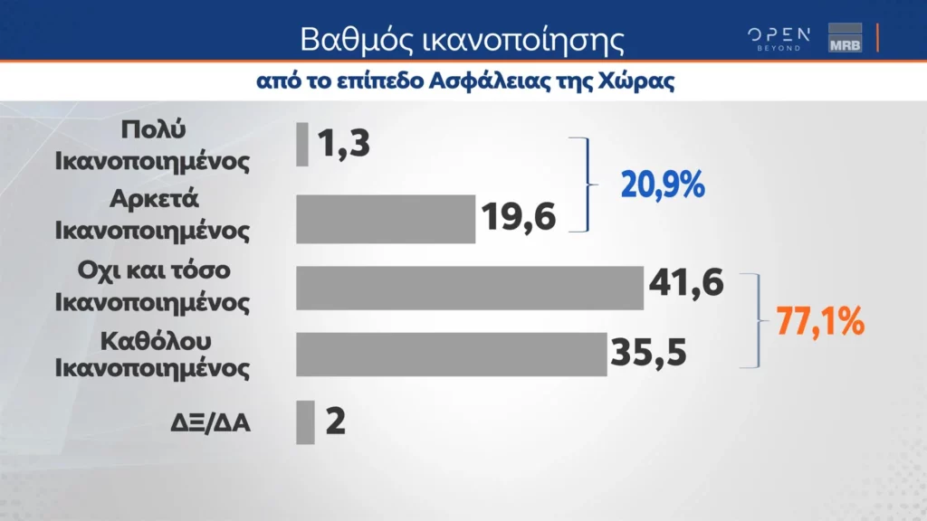 Αναφορικά με το επίπεδο ασφάλειας στη χώρα, οι πολίτες δήλωσαν σε ποσοστό 20,9% «πολύ» ή «αρκετά» ικανοποιημένοι, ενώ σε ποσοστό 77,1% δήλωσαν «καθόλου» ή «όχι και τόσο» ικανοποιημένοι.