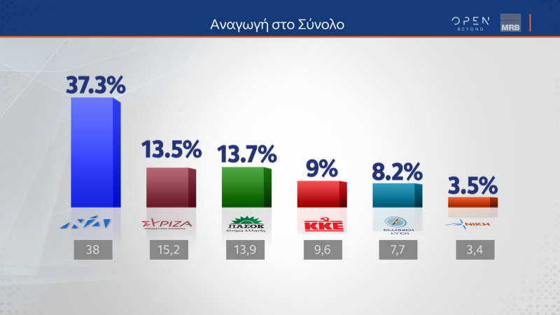 Όσον αφορά στην πρόθεση ψήφου, με αναγωγή στο σύνολο, η Νέα Δημοκρατία διατηρεί τα υψηλά ποσοστά της με 37,3%, ενώ το ΠΑΣΟΚ, έστω και οριακά, κρατάει τη δεύτερη θέση (δημοσκοπικά πάντα), με 13,7%, έναντι 13,5% του ΣΥΡΙΖΑ. Ακολουθεί με 9% το ΚΚΕ και με 9,2% η Ελληνική Λύση.