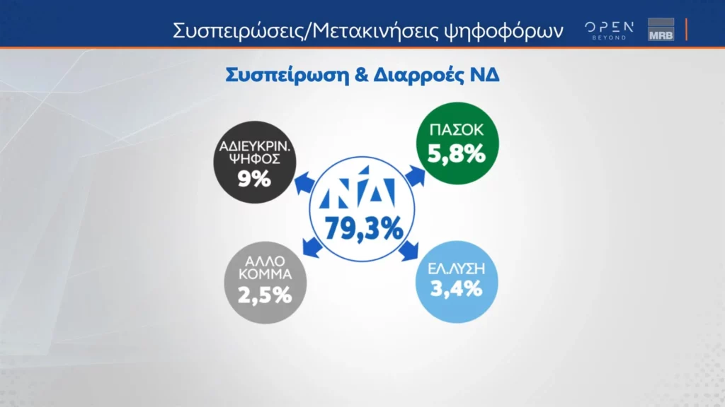 Σύμφωνα με τη δημοσκόπηση, η ΝΔ καταγράφει συσπείρωση 79,3% και έχει διαρροές 5,8% προς το ΠΑΣΟΚ, 3,4% προς την Ελληνική Λύση, 9% είναι αδιευκρίνιστη ψήφος και 2,5% προς άλλο κόμμα.