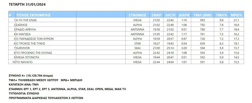 Απώλειες τηλεθεατών είχε η σατιρική «Ράδιο αρβύλα» και υποχώρησε στην τρίτη θέση των τηλεπροτιμήσεων. Η «Μάγισσα» πήρε την τέταρτη θέση καθώς χθες (31/1/2024) την είδαν 24.000 τηλεθεατές λιγότεροι από όσους την παρακολούθησαν την Τρίτη.