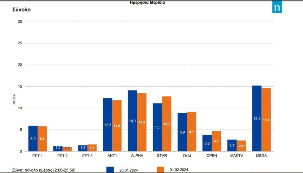 Δεύτερος σε προτιμήσεις, στο σύνολο της ημέρας, εμφανίζεται στις μετρήσεις της Nielsen για την ημέρα, ο Alpha καθώς αύξησε την απόδοση του κατά 1,1% εν αντιθέσει με τον ΑΝΤ1 ο οποίος από δεύτερη επιλογή των τηλεθεατών πέρασε στην τέταρτη θέση, καταγράφοντας απώλειες μιάμισης ποσοστιαίας μονάδας.