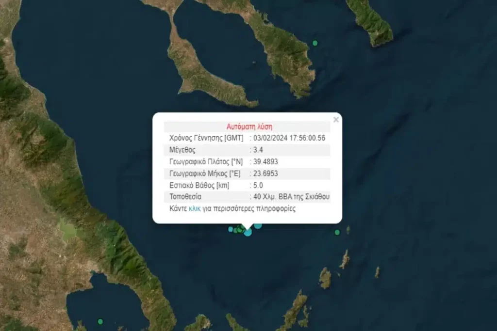 Σεισμική δόνηση, μεγέθους 3,4 βαθμών της Κλίμακας Ρίχτερ, σημειώθηκε στις 19:56 το βράδυ του Σαββάτου (3/2) στον θαλάσσιο χώρο ανοιχτά της Σκιάθου.