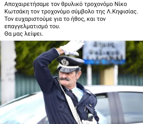 Δυστυχώς, έφυγε από τη ζωή. Πρόκειται για τον Νίκο Κωτσάκη, τον θρυλικό «Τροχονόμο της Αγίας Βαρβάρας». Βρίσκοταν πάντα στη διασταύρωση της Εθνικής Αντιστάσεως, στο Nέο Ψυχικό.