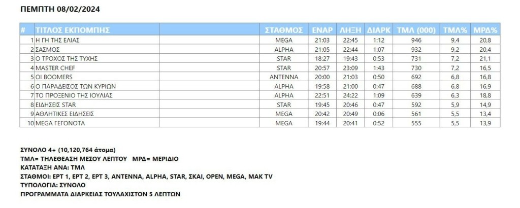 Τρίτη επιλογή της ημέρας ήταν ο «Τροχός της τύχης» και το μαγειρικό ριάλιτι «Masterchef» αναδείχθηκε τέταρτο δημοφιλέστερο πρόγραμμα. Στην πέμπτη θέση πλασαρίστηκε η νέα πρόταση «Boomers» των Αντώνη Κανάκη, Γιάννη Σερβετά, Χρήστου Κιούση, με τηλεθέαση 6,8%, ικανοποιητική πλην όμως δεν ήταν εφάμιλλη των πρόσφατων αποδόσεων του «Ράδιο αρβύλα».