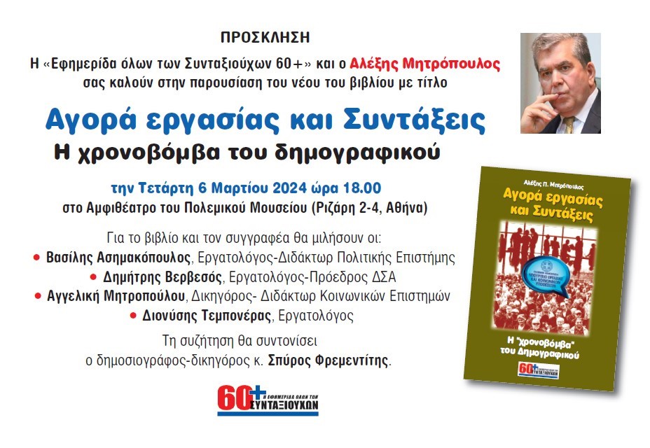 Ένα νέο βιβλίο με τίτλο «Αγορά Εργασίας και Συντάξεις – Η χρονομβόμβα του δημογραφικού» παρουσιάζεται στις 6 Μαρτίου 2024 και ώρα 18.00 στο αμφιθέατρο του Πολεμικού Μουσείου.
