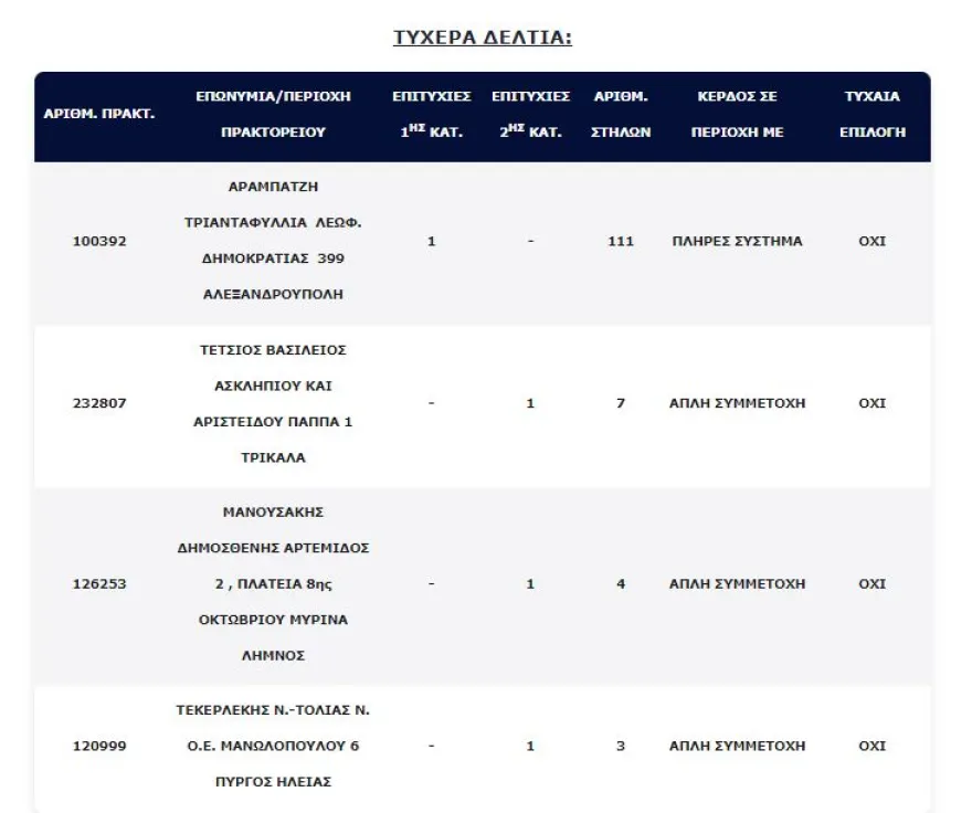 Εκτός από το τυχερό δελτίο στην 1η κατηγορία που κερδίζει το ποσό των €6.552.827,56 βρέθηκαν και τρία τυχερά δελτία στην 2η κατηγορία τα οποία κερδίζουν το ποσό των €100.000,00.