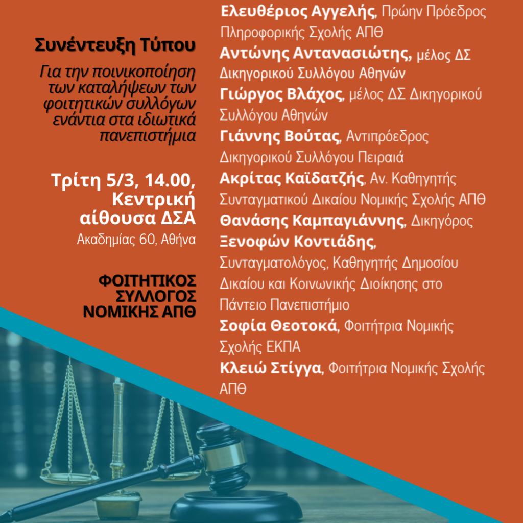Συνέντευξη Τύπου, με πρωτοβουλία του Φοιτητικού Συλλόγου Νομικής Α.Π.Θ., ο οποίος βρίσκεται στο στόχαστρο δύο εισαγγελικών ερευνών για τις καταλήψεις, πραγματοποιείται την Τρίτη (5/3) στις 2 το μεσημέρι, στην κεντρική αίθουσα του ΔΣΑ.