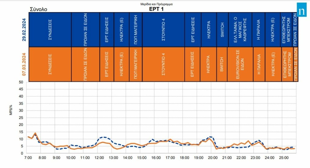 Στα αξιοπρόσεκτα της ημέρας η απόδοση της ΕΡΤ1 η οποία αν και χθες βράδυ, και δη στη ζώνη υψηλής τηλεθέασης επέλεξε να παρουσιάσει μέσα από ειδική εκπομπή το τραγούδι «Ζάρι» με το οποίο θα εκπροσωπηθεί η κρατική ραδιοτηλεόραση και η χώρα στον 68ο διαγωνισμό τραγουδιού της Eurovision, μερίδιο της δεν διαφοροποιήθηκε από εκείνο που είχε την ίδια ημέρα της περασμένης εβδομάδας.