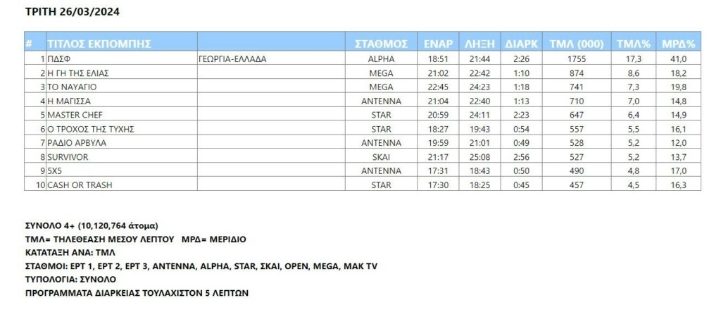 Τέσσερις στους δέκα τηλεθεατές στο διάστημα 18.50- 21.45 είχαν συντονιστεί χθες στον Alpha και παρακολούθησαν την καταλυτική ποδοσφαιρική αναμέτρηση Γεωργίας-Ελλάδας για την τελική φάση του Euro 2024.