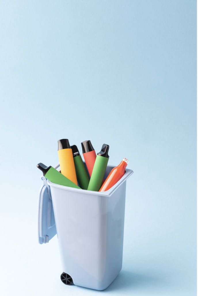 Η τεράστια αύξηση της χρήσης ηλεκτρονικών τσιγάρων δημιουργεί σημαντικές προκλήσεις στη διαχείριση μετά το τέλος της ζωής τους. Επίσης, τα ηλεκτρονικά τσιγάρα μιας χρήσης συνήθως αποτελούνται από μη επαναφορτιζόμενες μπαταρίες ιόντων λιθίου, η απόρριψη των οποίων χρειάζεται ιδιαίτερη προσοχή.