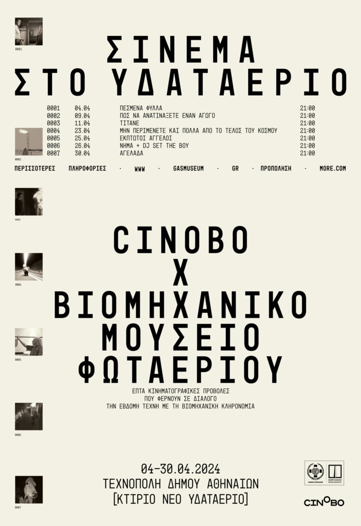 Το Cinobo και το Βιομηχανικό Μουσείο Φωταερίου συμπράττουν για μια σειρά κινηματογραφικών προβολών στο επιβλητικό κτίριο του Νέου Υδαταερίου στην Τεχνόπολη Δήμου Αθηναίων. Από τις 4 μέχρι τις 30 Απριλίου, το «Σινεμά στο Υδαταέριο» φέρνει την έβδομη τέχνη σε ανοιχτό διάλογο με τη βιομηχανική κληρονομιά, μέσα από επτά ταινίες οι οποίες επιλέχθηκαν από την ομάδα του Cinobo με έμπνευση τον μυσταγωγικό χαρακτήρα του ιστορικού χώρου του παλιού εργοστασίου φωταερίου της Αθήνας.