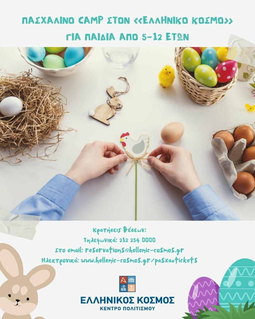 Η εναλλακτική κατασκήνωση του Κέντρου Πολιτισμού «Ελληνικός Κόσμος», με πασχαλινή, παιχνιδιάρικη διάθεση, δίνει την ευκαιρία στους μικρούς μας φίλους να γεμίσουν δημιουργικά τον χρόνο τους για πέντε ημέρες: Μ. Δευτέρα 29/4, Μ. Τρίτη 30/4, Τετάρτη 8/5, Πέμπτη 9/5 και Παρασκευή 10/5 του Πάσχα, από τις 09:00 μέχρι τις 15:00.