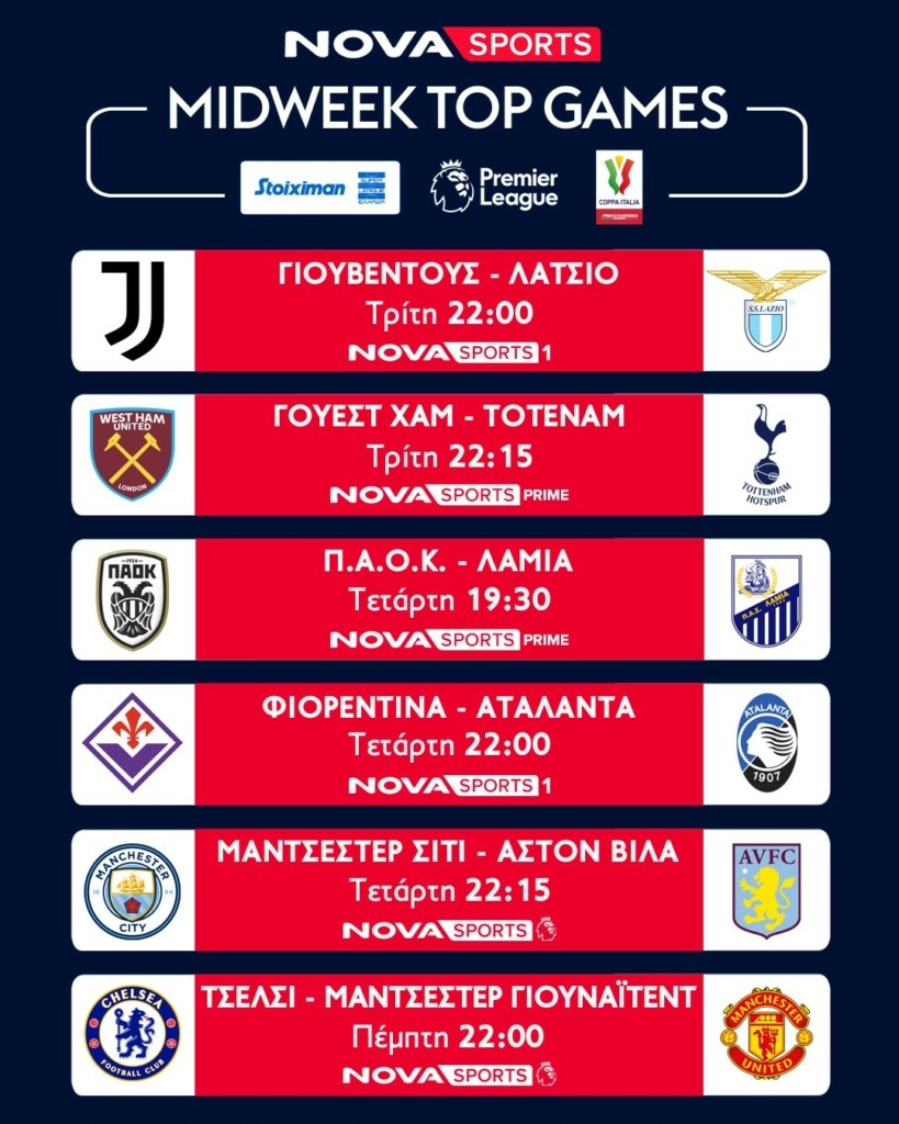 Πλούσιο αποκλειστικό ποδοσφαιρικό θέαμα με περισσότερους από 55 LIVE αποκλειστικούς αγώνες έρχεται να καθηλώσει κι αυτή την εβδομάδα τους συνδρομητές στο «γήπεδο» του Novasports! Με διπλή αγωνιστική για τα Playoffs της Stoiximan Super League και τους αγώνες ΠΑΟΚ – Λαμία και Άρης – Παναθηναϊκός, με δράση στα Playouts της Stoiximan Supe League και Ατρόμητος – Πανσερραϊκός & Αστέρας Τρίπολης – Κηφισιά, με διπλή Premier League και τα ντέρμπι Τσέλσι – Μάντσεστερ Γιουνάιτεντ & Μάντσεστερ Γιουνάιτεντ – Λίβερπουλ, με τα ημιτελικά του Coppa Italia, Γιουβέντους – Λάτσιο & Φιορεντίνα – Αταλάντα! Και φυσικά η Εθνική μας ομάδα ποδοσφαίρου γυναικών ξεκινά αυτή την εβδομάδα την προσπάθεια της για μια θέση στα Playoffs των προκριματικών του EURO 2025 με αντίπαλο τα Ν. Φερόε (5/4)!