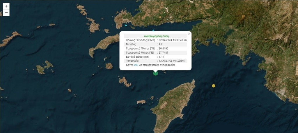 Το επίκεντρο του σεισμού, ο οποίος σημειώθηκε στις 4.33 μ.μ., σήμερα Τρίτη 2/4, εντοπίζεται σε θαλάσσια περιοχή στα Δωδεκάνησα, 11 χιλιόμετρα νότια – νοτιοδυτικά της Σύμης και 36 χιλιόμετρα βορειοδυτικά της Ρόδου.