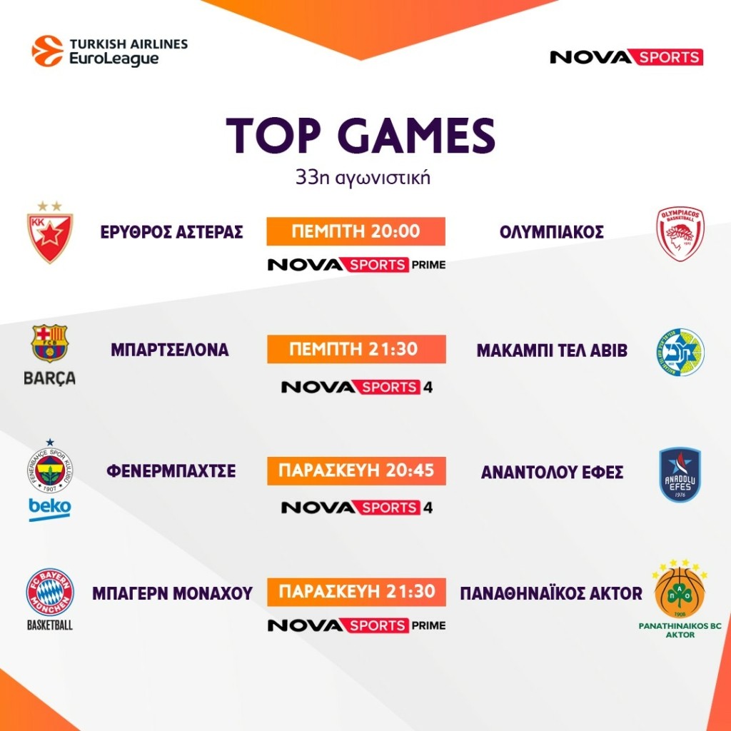 Η EuroLeague, μία στροφή πριν από το φινάλε της regular season με τις «μάχες» Ερυθρός Αστέρας – Ολυμπιακός & Μπάγερν Μονάχου – Παναθηναϊκός AKTOR, ο 3ος αγώνας της σειράς των ημιτελικών του EuroCup Μπουργκ – Μπεσίκτας και το Final Four του κολεγιακού πρωταθλήματος του NCAA έρχονται να καθηλώσουν τους συνδρομητές αυτή την εβδομάδα στο παρκέ του Novasports!