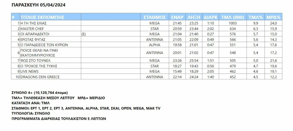Ενδεικτικό είναι πως η διαφορά τηλεθέαση μεταξύ της πρώτης σε δημοφιλία εκπομπής και της τελευταίας ήταν πάνω από 50%.