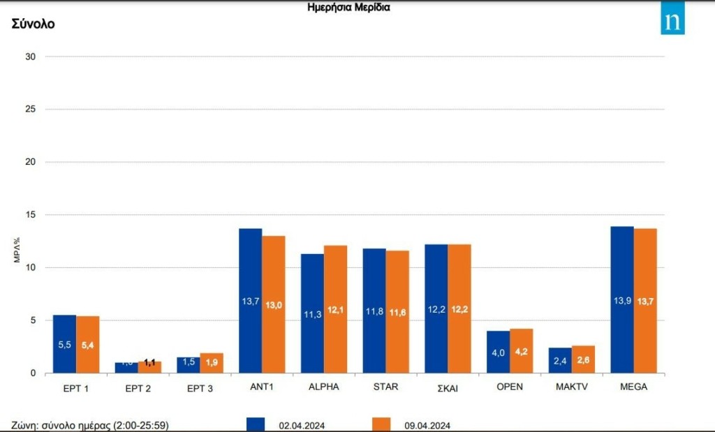 Στο ταμείο της ημέρας ο Alpha βελτίωσε το αποτύπωμα του στην πίτα τηλεθέασης των καναλιών εθνικής εμβέλειας, από μέρα σε μέρα.