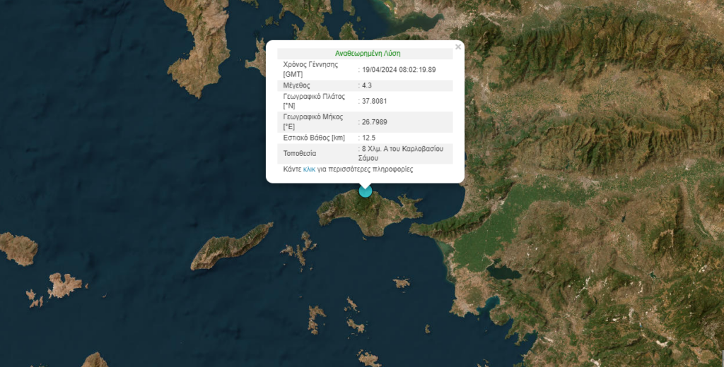 Σεισμός 4,3 βαθμών της κλίμακας Ρίχτερ σημειώθηκε πριν από λίγα λεπτά στη Σάμο, με το επίκεντρο να εντοπίζεται 12,5 Χλμ. ανατολικά του Καρλοβασίου.