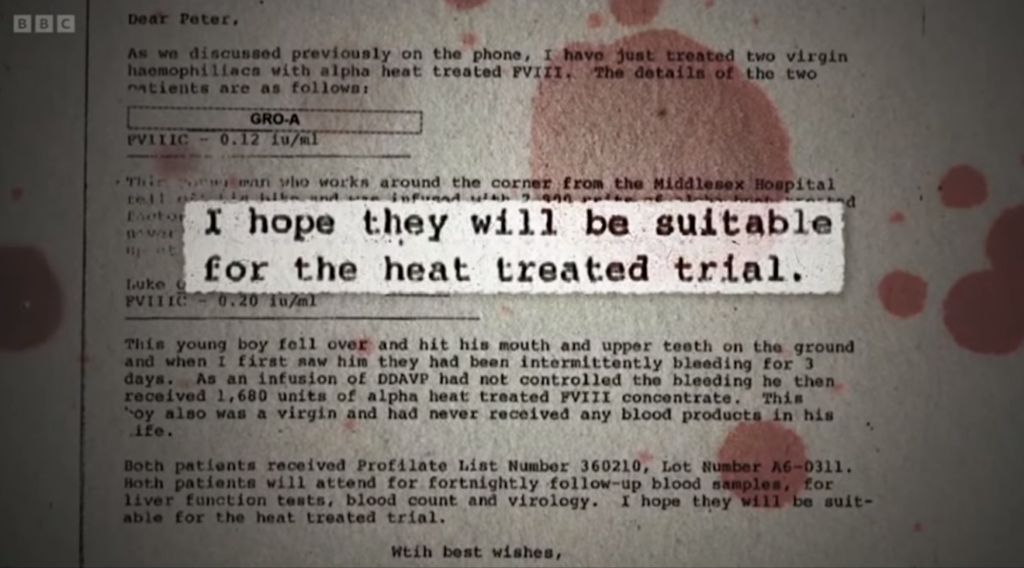 Σύμφωνα με τα έγγραφα που έχει στη διάθεσή του το BBC ο ασθενής πήρε προϊόν αίματος που ο γιατρός γνώριζε ότι ίσως ήταν μολυσμένο, αλλά το χρησιμοποίησε για να κάνει κλινική δοκιμή. Ο γιατρός ήθελε να διαπιστώσει πόσο πιθανό είναι ασθενείς να προσβληθούν από ασθένειες μετά από νοσηλεία με ένα νέο προϊόν, γνωστό ως FactorVIII.
