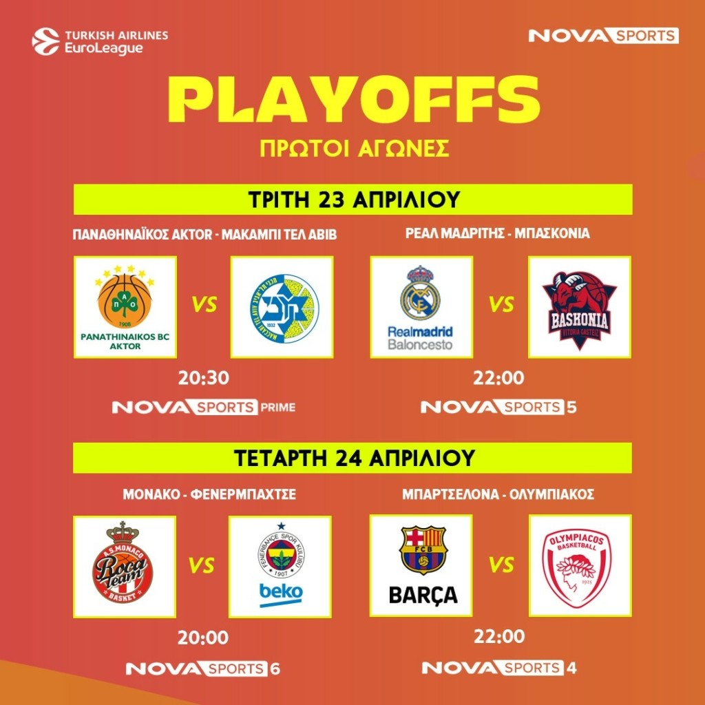 Αθήνα, 22 Απριλίου 2024. Η EuroLeague, η κορυφαία ευρωπαϊκή διασυλλογική διοργάνωση στο χώρο του μπάσκετ που οι φίλοι της πορτοκαλί μπάλας απολαμβάνουν αποκλειστικά στο παρκέ του Novasports με την κορυφαία δημοσιογραφική ομάδα των Playmakers, ετοιμάζεται για το τζάμπολ στα Playoffs! Το Novasports θα είναι εκεί για να καλύψει με τον αρτιότερο τρόπο την προσπάθεια του Παναθηναϊκού AKTOR κόντρα στην Μάκαμπι Τελ Αβιβ και του Ολυμπιακού κόντρα στην Μπαρτσελόνα για πρόκριση στο Final Four του Βερολίνου, καθώς και τα άλλα δύο ζευγάρια Ρεάλ Μαδρίτης – Μπασκόνια και Μονακό – Φενέρμπαχτσε.