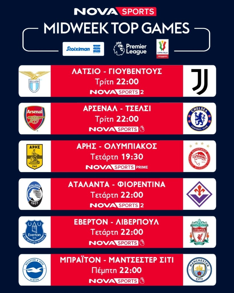 Αθήνα, 23 Απριλίου 2024. Καταιγισμός ντέρμπι σε Ελλάδα και Ευρώπη και περισσότεροι από 60 LIVE συναρπαστικοί αγώνες έρχονται αυτή την εβδομάδα στο «γήπεδο» του Novasports! Με Άρης – Ολυμπιακός & ΠΑΟΚ – ΑΕΚ για τα Playoffs της Stoiximan Super League, με Άρσεναλ -Τσέλσι, Έβερτον – Λίβερπουλ, Τότεναμ – Άρσεναλ για την Premier League, με τις ρεβάνς των ημιτελικών του Coppa Italia, Λάτσιο – Γιουβέντους & Αταλάντα – Φιορεντίνα. Και με Μονακό – Λιλ, Μαρσέιγ – Λανς, Λιόν – Μονακό στη Ligue 1, με Ρεάλ Σοσιεδάδ – Ρεάλ Μαδρίτης, Ατλέτικο Μαδρίτης – Αθλέτικ Μπιλμπάο, Μπέτις – Σεβίλλη στη LaLiga EA Sports και άλλα πολλά!