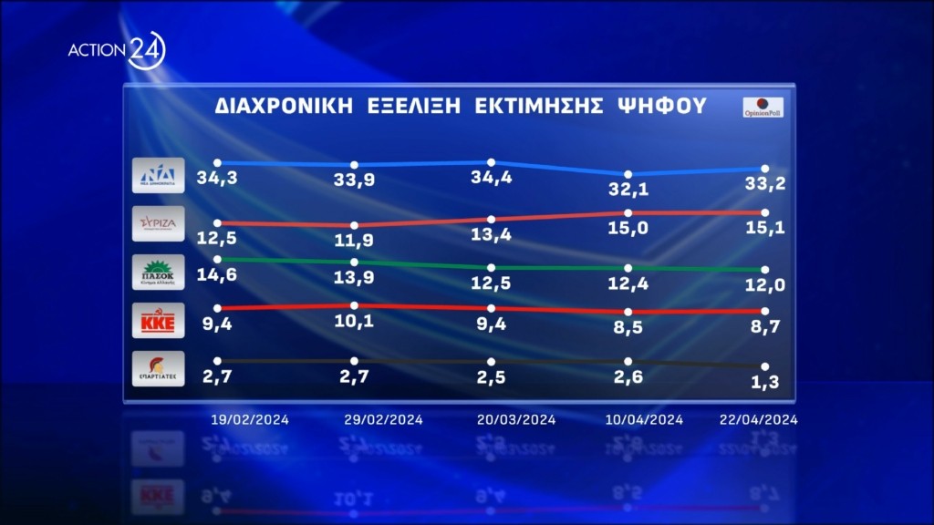 Την πρώτη δημοσκόπηση μετά την ανακοίνωση των υποψηφίων των κομμάτων για τις ευρωεκλογές παρουσίασε το Action 24.