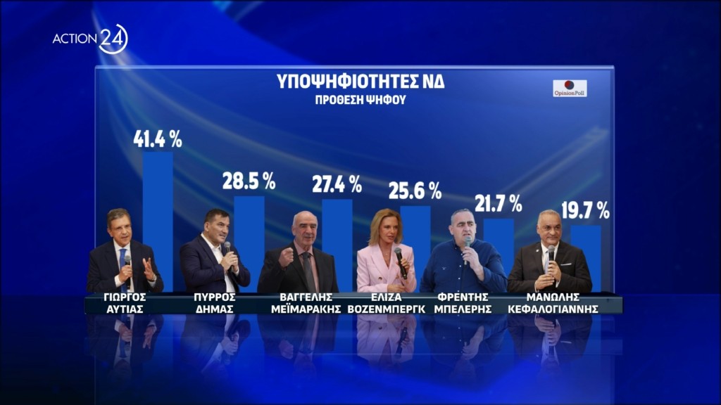 Ειδικότερα, όσον αφορά τη Νέα Δημοκρατία, καθαρό προβάδισμα καταγράφει ο Γιώργος Αυτιάς (41,4%), ακολουθεί ο Πύρρος Δήμας με 28,5% και ο Βαγγέλης Μεϊμαράκης με 27,4%. Ο Φρέντι Μπελέρης, η υποψηφιότητα του οποίου προκάλεσε αντιδράσεις και εντός ΝΔ, φτάνει στο 21,7%, στην πέμπτη θέση, πίσω και από την Ελίζα Βόζεμπεργκ (25,6%).