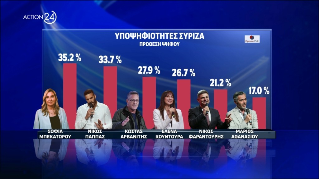Όσον αφορά τις υποψηφιότητες του ΣΥΡΙΖΑ καταγράφεται πρωτιά της Σοφίας Μπεκατώρου με 35,2% και ακολουθεί ο Νίκος Παππάς με 33,7% και ο Κώστας Αρβανίτης με 27,9%.