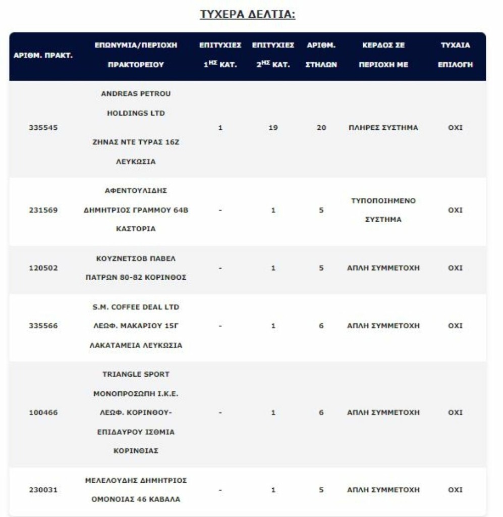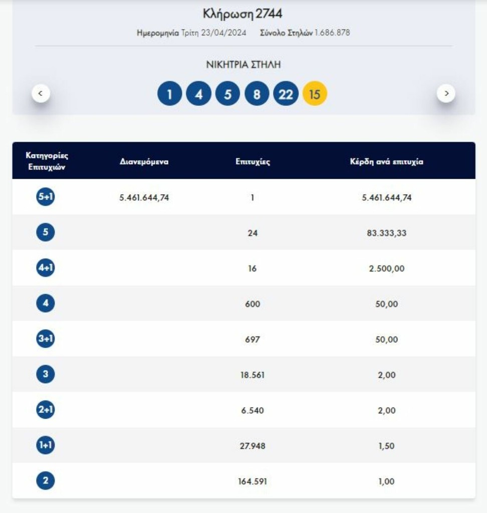 Ειδικότερα, η επιτυχία στην 1η κατηγορία (5+1) χάρισε 5.461.644,74 ευρώ στον μεγάλο τυχερός, ενώ για κάθε μια από τις 19 επιτυχίες στη 2η κατηγορία θα δοθούν από 83.333,33 ευρώ.