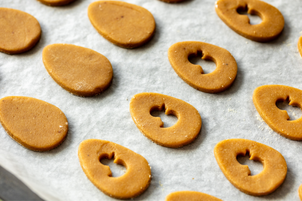 4. Στη συνέχεια πάρτε ένα κομμάτι λαδόκολλας, πασπαλίστε το με λίγο αλεύρι και με τη βοήθεια ενός πλάστη ανοίξτε τη ζύμη σε πάχος περίπου 3 χιλιοστών.Κόψτε με κουπ πατ ή σχεδιάστε με πατρόν πασχαλινά σχήματα για τα μπισκότα. Στα μισά μπισκότα κόψτε ένα μικρό άνοιγμα για να κάνετε ένα παραθυράκι για την κρέμα φουντουκιού.