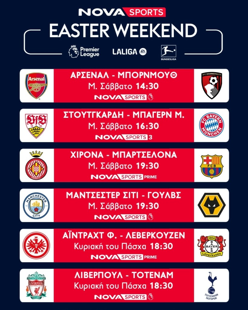 Πλούσιο ποδοσφαιρικό θέαμα μέσα στο Πάσχα έρχεται στις οθόνες των συνδρομητών του Novasports! Με Λίβερπουλ – Τότεναμ, Μάντσεστερ Σίτι – Γουλβς, Άρσεναλ – Μπόρνμουθ με φόντο την μάχη για την κατάκτηση του τίτλου στην Premier League και με Ρεάλ Μαδρίτης – Κάδιθ, Χιρόνα – Μπαρτσελόνα, Μαγιόρκα – Ατλέτικο Μαδρίτης για την LaLiga EA Sports. Με Άιντραχτ Φρανκφούρτης- Λεβερκούζεν, Στουτγκάρδη-Μπάγερν Μονάχου, Ντόρτμουντ – Άουγκμπουργκ για την Bundesliga και με Λιλ – Λιόν, Mονακό – Κλερμόν, Λανς – Κλερμον για την Ligue 1.