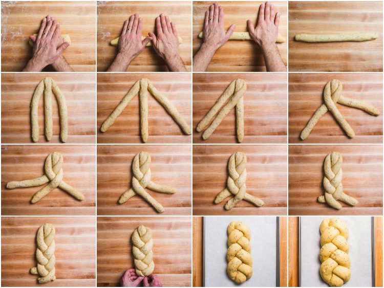 6. Μόλις επιτευχθεί ο διπλασιασμός, χωρίστε τη ζύμη σε 3 ίσα μέρη και σχηματίστε πιέζοντας απαλά με τα χέρια σας, 3 μπαστούνια. Πλέξτε σε κοτσίδα, όπως το παρακάτω σχέδιο ή όπως αλλιώς επιθυμείτε.