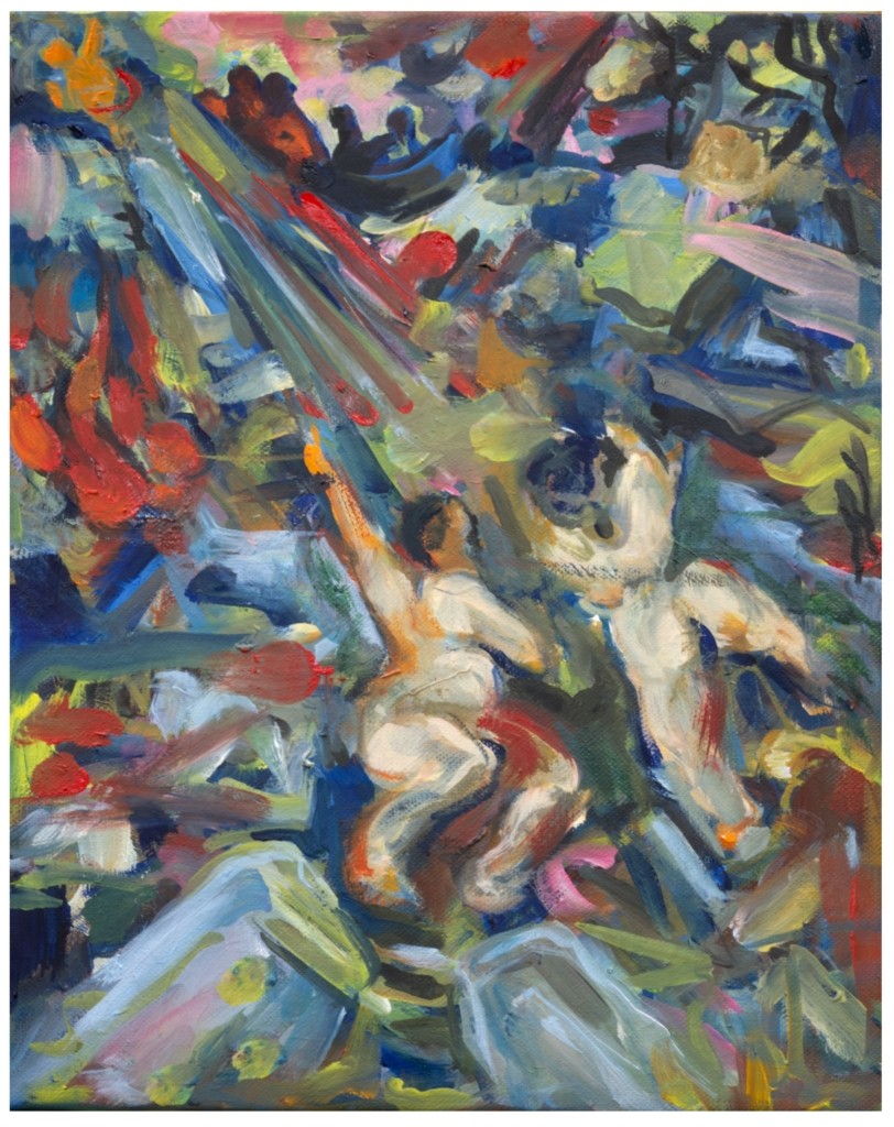 Αντλώντας την έμπνευσή της από την αρχαία ελληνική μυθολογία, η εικαστικός δημιούργησε μια σειρά από πίνακες που αναφέρονται στην ιστορία του Δία και της Ιούς – που την αγκαλιάζει σαν σύννεφο για να μην τη βρει η Ήρα! «Αυτά τα έργα τα ονόμασα “Studies in to darkness” και έχουν γίνει με περιορισμό χρωμάτων κι ήμουν και σε μια εσωστρεφή περίοδο. Ήμουν Αμερική εκείνο το διάστημα κι ήταν πολύ σκοτεινά, έμενα κοντά στον Καναδά – και ξεκινάει αυτή η σειρά έπειτα από τη μελέτη που έχω κάνει σε έναν πίνακα του Κορρέτζιο. Είναι η Ιώ και ο Δίας και έχει σχέση με την επιθυμία. Η επιθυμία είναι κάτι το σκοτεινό, χρειάζεται αποκρυπτογράφηση αν θες, οπότε δούλεψα με μια τεχνική που λέγεται μονοτυπία, η οποία είναι ένα αντίτυπο δοσμένο με διαφορετικό τρόπο κάθε φορά».