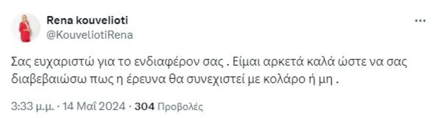 «Σας ευχαριστώ για το ενδιαφέρον σας. Είμαι αρκετά καλά ώστε να σας διαβεβαιώσω πως η έρευνα θα συνεχιστεί με κολάρο ή μη», έγραψε στο Χ η ρεπόρτερ.
