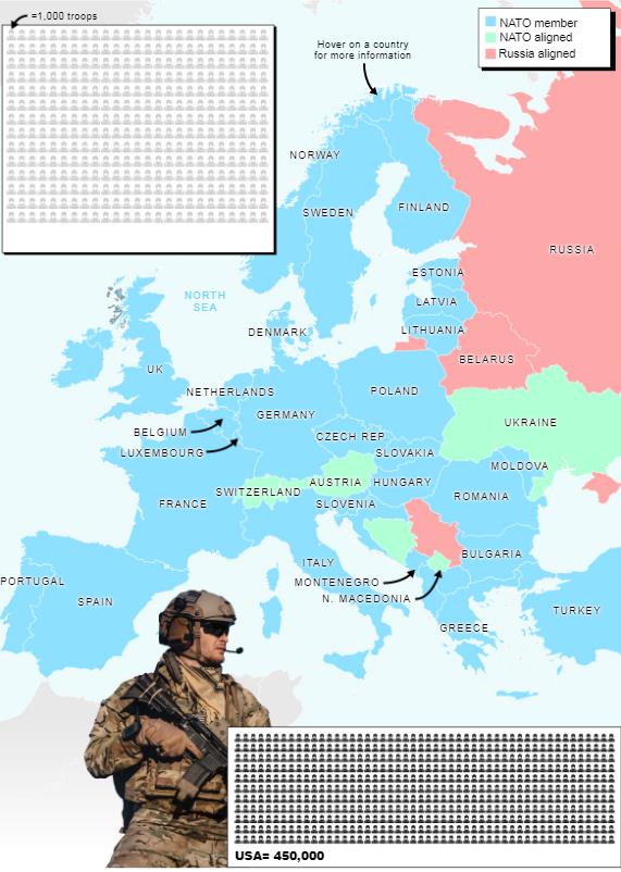Ο Μπεν Χόντζις, πρώην διοικητής του αμερικανικού στρατού στην Ευρώπη δήλωσε στην MailOnline ότι τα ευρωπαϊκά κράτη θα μείνουν μόνα τους αν ο Τραμπ εκλεγεί πρόεδρος τον Νοέμβριο. Και αν βγουν από την εξίσωση οι δυνάμεις των ΗΠΑ και του Καναδά, οι αριθμοί δείχνουν απόλυτη ισορροπία τρόμου ανάμεσα στα στρατεύματα των ευρωπαϊκών κρατών και της Ρωσίας.