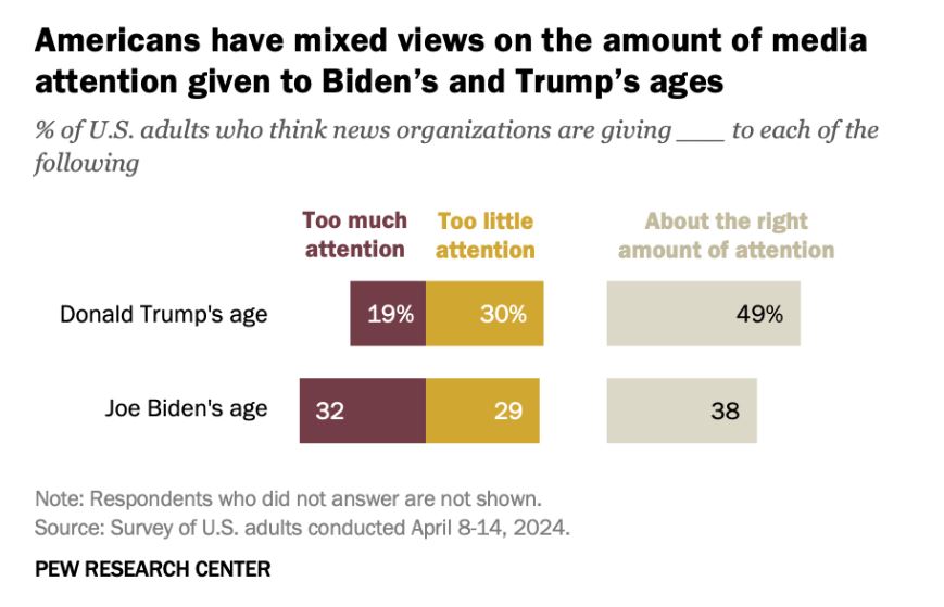 Σε ό,τι αφορά στην ειδησεογραφία που αφορά στην ηλικία του Τράμπ οι Αμερικανοί θεωρούν ότι τα ΜΜΕ υπερβάλουν στα σχετικά ρεπορτάζ τους (19%), περισσότερο πιστεύουν ότι δείχνουν προσοχή στη σωστή ποσότητα (49%).