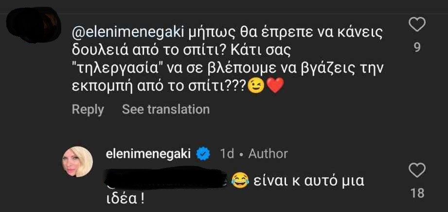 Στο παραπάνω, η Ελένη Μενεγάκη απάντησε αρχικά με ένα emoji που γελάει και συνέχισε, γράφοντας: «Είναι κι αυτό μια ιδέα».