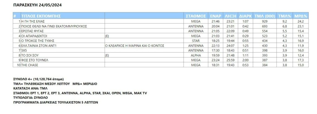 Η αλήθεια είναι πως ο γενικός δείκτης την Παρασκευή σημείωσε υποχώρηση σε όλα τα κανάλια, συνέβαλε όμως στην αλλαγή χαρακτηριστικών ανταγωνισμού και στη δεκάδα εμφανίστηκαν προγράμματα όπως το «Φως στο τούνελ» και «The chase».