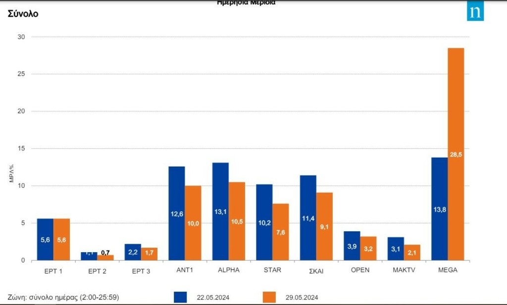 Το μερίδιο του Mega διαμορφώθηκε στο 28,5% και αποτελεί νέο ρεκόρ στα νεότερα τηλεοπτικά χρονικά, καταρρίπτοντας το 26,5% που είχε καταφέρει η ΕΡΤ1 με τον τελικό της Eurovision στις 18 Μαΐου.